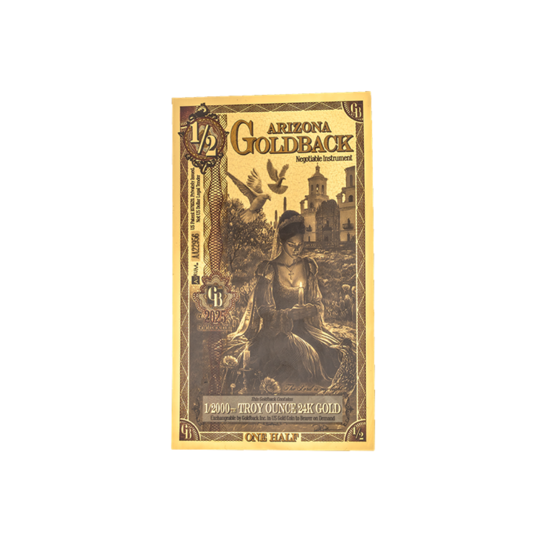 This 1/2 Goldback celebrates Arizona's spiritual heritage through the virtue of Fides (Faith). The design features a contemplative young woman in traditional Spanish dress, holding a candle that symbolizes the enduring light of faith brought by the region's earliest missionaries. Surrounding her, the Sonoran Desert flourishes with native flora and fauna—blooming cacti, a roadrunner, elf owl, and spiny lizard—alongside a lemon tree representing the agricultural legacy of the missions. White doves ascend toward San Xavier del Bac, the iconic "White Dove of the Desert," anchoring this tribute to Catholic heritage and the transformative influence of Spanish settlement in the Southwest.