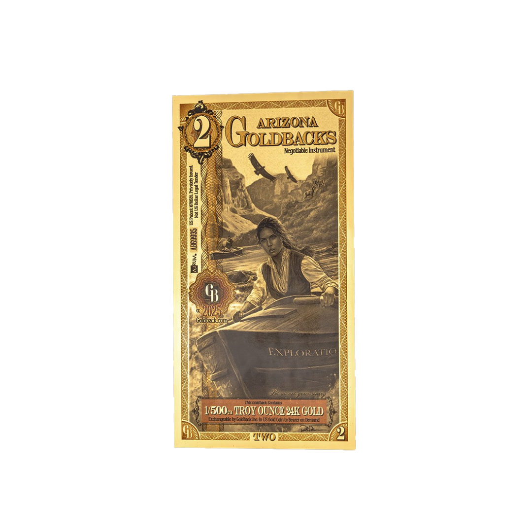 This 2 Goldback celebrates Arizona's pioneering spirit through the lens of the 1869 Powell Geographic Expedition, the first documented boat journey through the Grand Canyon's formidable depths. The design captures the essence of Exploration, honouring those intrepid adventurers who ventured into uncharted waters to map and understand one of Earth's most magnificent natural wonders. A numismatic tribute to human curiosity and the relentless pursuit of discovery.