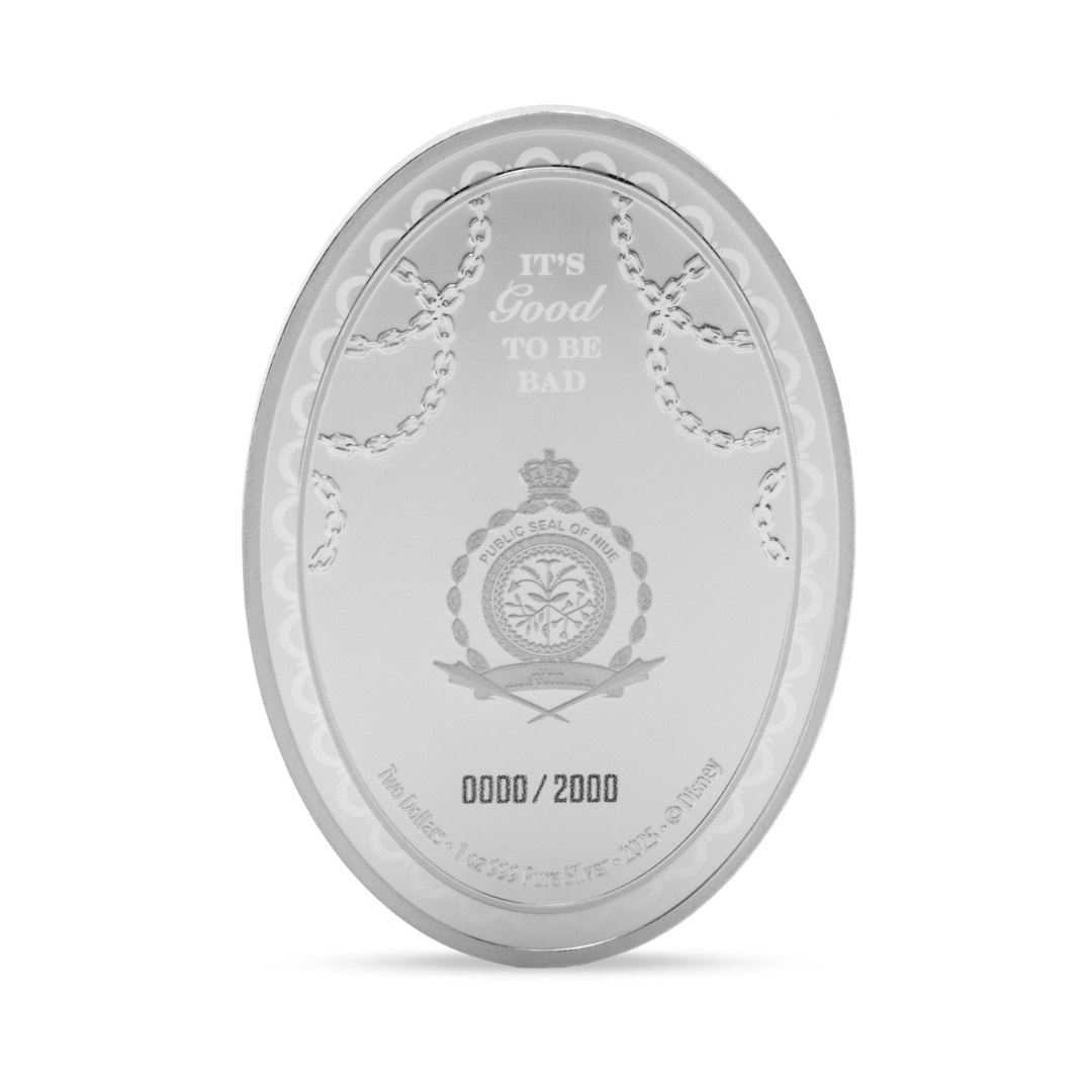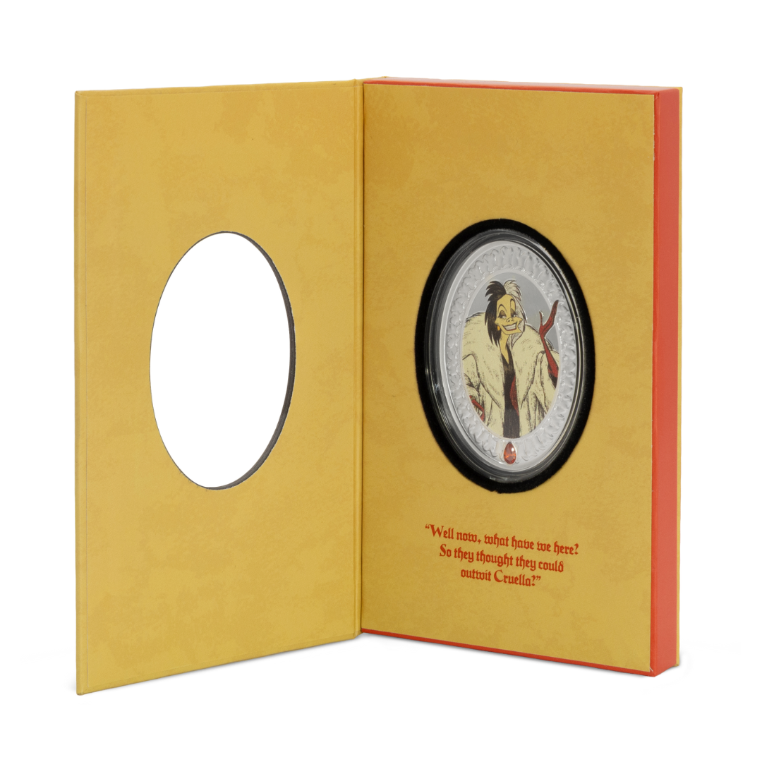 Disney’s most devilish fashionista, Cruella De Vil, is here, captured in 1oz of 999 pure silver. Her sharp features, striking black-and-white hair, and fiery red attire are brought to life in vivid colour and proof detail.