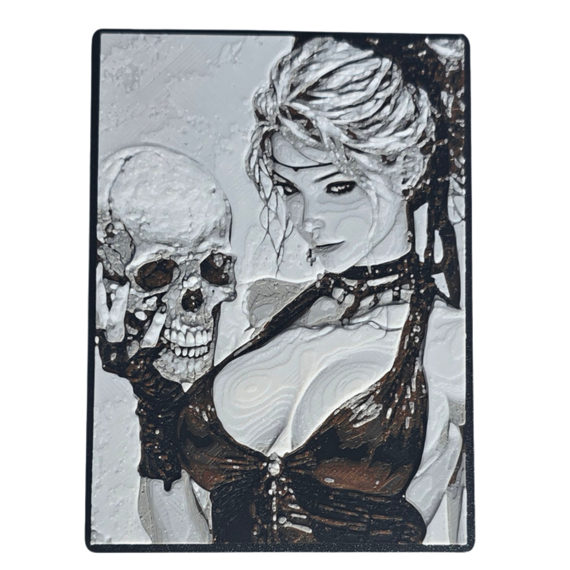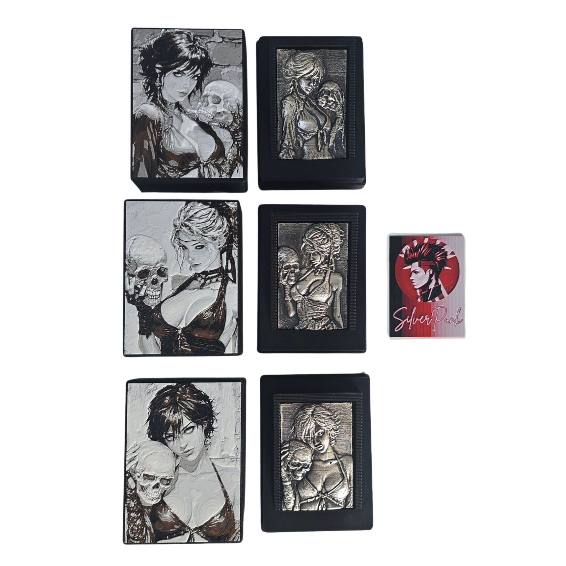 This exquisite single panel miniature artwork set crafted from 999 pure silver captures three beautiful smouldering women all holding skulls. This set has three individually crafted panels in their own 3D printed matching boxes. They are incredibly detailed and strikingly beautiful.