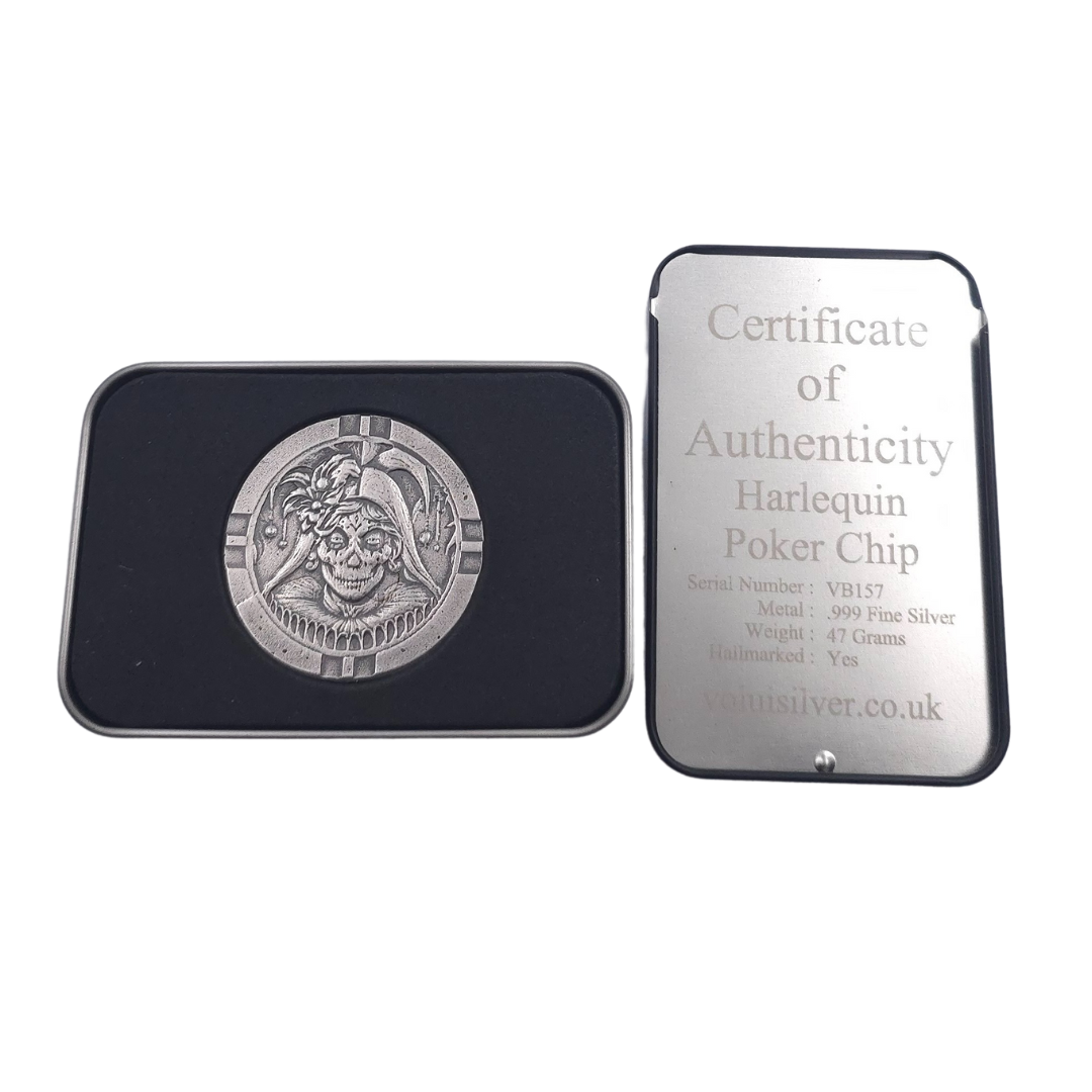 Volui Silver's hand-poured Harlequin Poker Chip round delivers 47g of pure silver crafted with meticulous artisan precision.